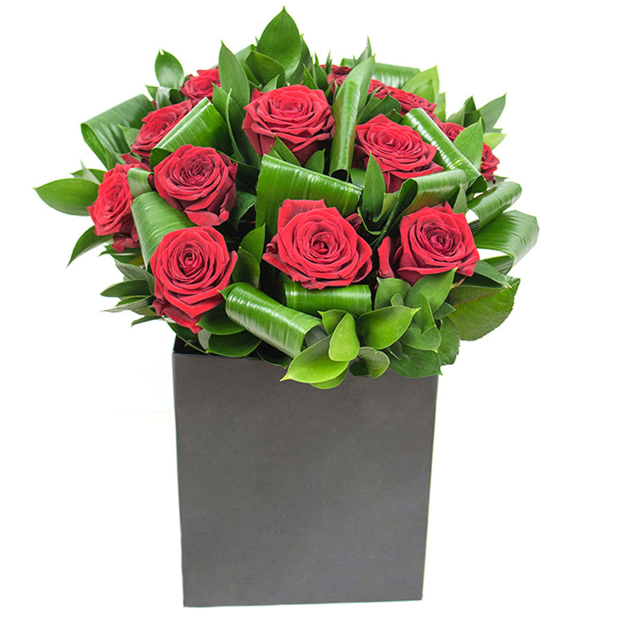 Celebrate beauty with our timeless bouquet featuring classic red roses, elegant aspidistra leaves, and fresh ruscus. This sophisticated arrangement is designed to bring elegance and charm to any occasion.